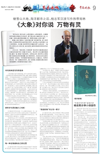3月23日,“雨林深处,万物有灵”杨志军《大象》青岛首发分享会在良友书坊·塔楼1901举办。杨志军与对谈嘉宾高建刚、臧杰一起,解读了他的新作。分享会之前,杨志军与记者畅聊了如何走出写作舒适圈,进入雨林深处。他坦言这次全新的创作是一次挑战,“写作就是不断否定自己、丰富自己。”获得茅奖之后,“我一如既往在写作。唯一的影响,就是更加意识到时间的重要性,想把更多时间投入写作。”