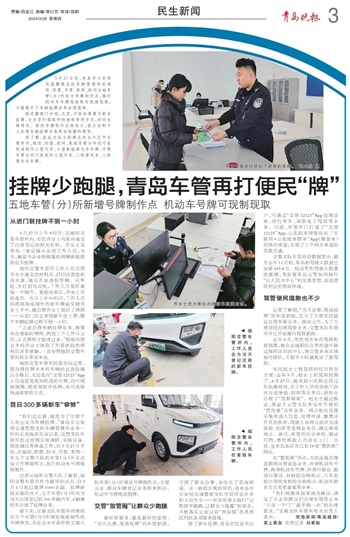 3月27日起,青岛市公安局交通警察支队车辆管理所在城阳、即墨、平度、莱西、胶州五地车管(分)所设立号牌制作点,推行机动车号牌现场制作现场领取,大幅提升了车辆挂牌业务办理效率。