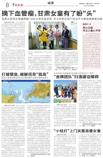 本报3月27日讯 8岁女孩婷婷来自甘肃庆阳,因患有头枕部血管瘤,在当地医院接受了两次切除手术后病情复发。在青岛微尘和甘肃当地公益组织的资助下,婷婷跨越1300公里来到青岛,在青岛市市立医院脑科中心本部神经外科的治疗下,彻底切除病灶。3月27日,婷婷顺利出院。