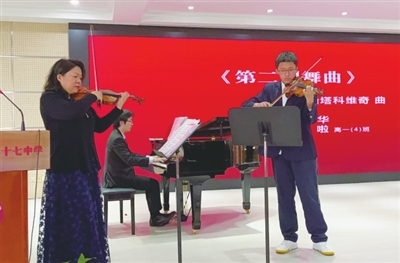 学校高一4班学生左啦作为十七中学生代表与盛小华、黄勰合奏,点燃现场氛围。“能与盛教授同台演出,我感到非常荣幸。盛教授的小提琴技艺高超精湛,给了我很多宝贵的专业指导。”左啦说,盛教授启发他演奏中西方音乐时可以追求意象的表达,使他更好地理解音乐的本质和内涵。