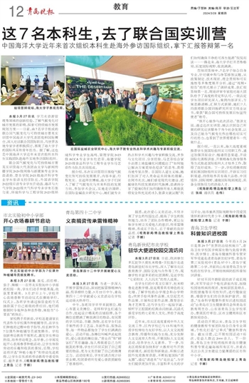 本报3月27日讯 学习水资源管理等领域的创新经验,了解气候变化对城市发展的影响,探索可持续城市发展规划方案……日前,由7名学子组成的联合国气候变化与可持续城市菁英实训营中国海洋大学代表团亮相国际舞台,深入对话联合国国际职员,与世界各地专家学者积极探讨,展现了海大学子的国际风采和青年担当。据了解,这也是中国海洋大学近年来首次组织本科生实践团队赴海外实地参访国际组织。