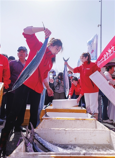 节会现场,几位销售西施牌大鲅鱼的姑娘忙得不亦乐乎。“今天统一售价,40元一斤。”工作人员高恺告诉记者,当天最重的鲅鱼达18斤。到开幕式结束,这家展位已经销售约750公斤鲅鱼。记者了解到,每年深秋鲅鱼开始进入越冬期,次年2月份鲅鱼陆续离开越冬场洄游。由于今年鲅鱼节比往年提前,目前海水温度较低,鲅鱼的捕捞量并不大。随着气温逐步回暖以及渔汛的来临,4月中旬以后,鲅鱼的捕捞量会逐渐增加。“预计一周左右,大家在各个市场上就能看到咱当地鲅鱼了。”一位船长表示。