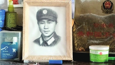 在一旁的柜子上,一张相框正对着老人,相框中的照片上,一位身着军装、目光坚毅的年轻人,似乎在凝视这感人的一幕。这张相片,是老人的大儿子——烈士管金平的遗照。