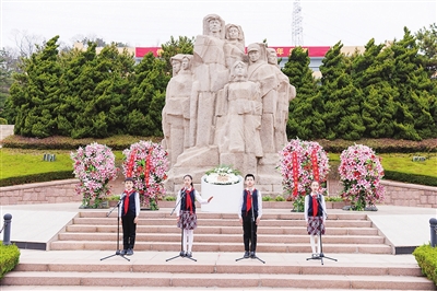 “弘扬英烈精神,赓续红色血脉;争做时代新人,唱响青春壮歌……”来自青岛市市南区实验小学的雷翔云等四名青岛市中小学生代表在山河魂群雕下深情朗诵原创诗歌《在烈士陵园里》,用深情而坚定的声音表达对革命先烈最真切的怀念与崇敬。随后,全体少先队员代表合唱《我们是共产主义接班人》。仪式结束后,全体人员依次向革命烈士敬献鲜花,寄托深切哀思。青岛市南京路小学230余名学生代表前往抗战展厅聆听英烈故事,重温红色历史。