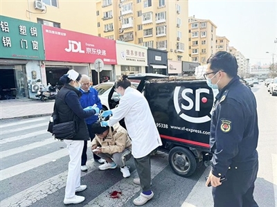 “当时骑电动车的小伙子是逆行过来的,车速快,他还没戴头盔,就听见‘砰’的一声响,他的车就碰到了快递三轮车上,头也直接撞上了三轮车后斗。撞击力度太猛了,当时血就流了一脸一地。”说起6日上午巡查时偶遇的事故,郭岩说,事发突然,路过的几名行人吓得惊慌失措,电动车车主和快递小哥也当场蒙了。因为工作中接受过相关救护培训,他立即和苏圣斌默契分工,他上前查看了电动车车主的情况,并叮嘱他不要乱动,避免二次受伤,苏圣斌则马上拨打了120,并找来纸巾帮忙止血。