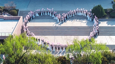 伴随着悠扬的音乐,100对校友新人们身着盛装,走过红毯,在樱花大道、图书馆、凯旋广场、东区体育场上组成心形、OUC、100、1924-2024等造型,留下了自己爱的印记。