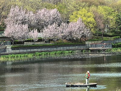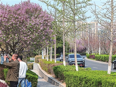 4月10日上午,记者在李沧区东部、李村河上的铜川路桥附近看见,衡水路两侧的樱花、玉兰、丁香等花卉已经盛开,不少市民在此打卡赏花。李沧园林工作人员告诉记者,樱花作为深受市民们喜爱的观赏花,在李沧区也有着广泛种植。