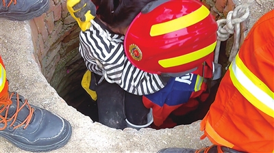 为了将女孩尽快救上来,急救人员在井口搭起三脚架,测试了井下的含氧量,确保空气流通后,一名经验丰富的救援人员做好防护,腰间缠上救援绳索,在同事们的配合下,携带护具和救援绳慢慢下到井内。到达井底后,救援人员发现女孩左侧大腿肿胀,脸部有擦伤,眼部肿胀。救援人员根据医护人员的指导,用护具将女孩左腿固定住,在她的腰部打上安全结,做好必要防护后,将她抱起,由井上的救援人员拉回地面,移交医护人员救治。