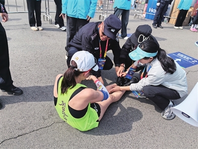 当天上午9时许,在半马终点领奖处,一参赛女子腿部抽筋倒在地上,市南公安分局奥帆中心治安派出所执勤民警李大军立刻上前,协助她的同伴为她拉伸,帮助减轻痛苦,直至医疗人员到场对其做进一步治疗。上午10时许,随着气温逐渐升高,在雕塑园公交车站附近,一名参赛男子中暑抽筋,体力不支险些晕倒。在附近执勤的海岸警察支队金家岭派出所民警立刻上前搀扶,青岛卫生学校医疗志愿者施救,并将他转移到安全地点,通知急救车辆到场。