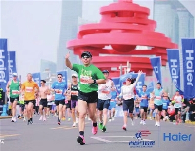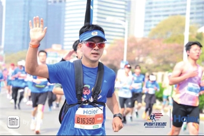 青岛市人民检察院检察官李优民以赛会海尔旗手的身份参加青岛全马,今年成绩4小时17分。马拉松结束后,李优民发了一条朋友圈:爱青岛,爱青马。生涯不堪几度,难得几个“胶带”。他告诉记者,“胶带”是谐音梗,给自己一个“交代”的意思。