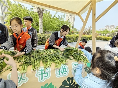 在随后的环节,学校还开展了“以书换蔬”促进资源持续利用的公益活动。学生们用家中不看的图书来交换农场中种植的新鲜蔬菜,既吃到了绿色无公害的绿色蔬菜,同时也可以将这些闲置图书分享给其他同学阅读,实现了资源的回收再利用。