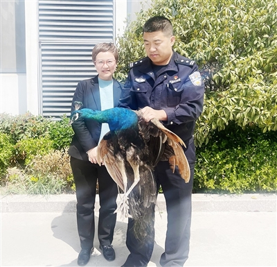 本报4月22日讯 4月18日上午,青岛市公安局海岸警察支队前程派出所接到报警,华仁金都华府小区内出现一只蓝孔雀,可能有伤。