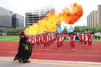 赛龙舟、打腰鼓、舞龙舞狮……开幕式上,同学们组成特色社团方队和班级方队,围绕“传承非遗文化”为主题,精心设计服装和道具。京剧变脸、武术表演、扇子舞等非遗文化表演轮番上演,既承载着丰富的历史、文化和艺术内涵,也展现了学子们谨记使命担当、弘扬传统文化的决心。