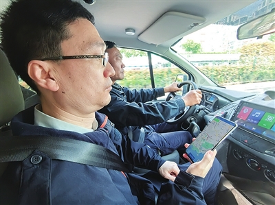 记者注意到,同车的急救中心工作人员手持急救终端,屏幕上规划的路线是劲松三路向北、左转合肥路,再一路向西直达目的地。
