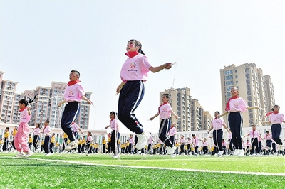 学校将传统文化与体育技能培养有机结合,先后开发了民族鼓、中国龙、街舞、花样跳绳、啦啦操及篮球、橄榄球、足球、手球等不同的社团课程。运动会上,阳光少年们带来了精彩的社团课程展示。学校打造“全员加入、全程参与、全身律动”的大课间活动模式,在校园“微体育”活动中,课间的花样跳绳已成为一道亮丽的风景线。运动会上,学校三、四、五年级学生共同带来科目三特色跳绳表演。