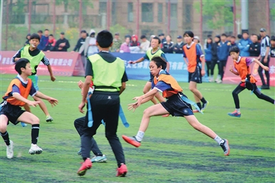 本报5月26日讯 25日上午,2024年山东省学校腰旗橄榄球比赛在青岛中德生态园德国足球亚洲基地盛大开幕。比赛为期两天,共分为U8、U10、U12、U15、U18、成人6个组别,来自全省的30余支队伍、400余名运动员同场竞技。