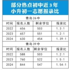 今年26中学位517个,已录取足球后备人才28人和其他符合优待条件的学生35人,剩余学位454个,第一志愿报名人数为630人。报录比约为1.39:1。39中学位658个,已录取高层次人才子女4人、海大教职工子女63人和其他符合优待条件的学生44人,剩余学位547个,第一志愿报名人数为844人,报录比为1.54:1。7中今年第一志愿报名人数为73人,全部录取。从去年数据来看,39中报录比1.5:1,青岛26中1.2:1,这也意味着今年“小升初”39中的热度继续超过26中。