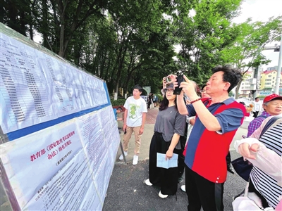 在青岛二中考点,考生和家长看考场信息。栾丕炜 摄
