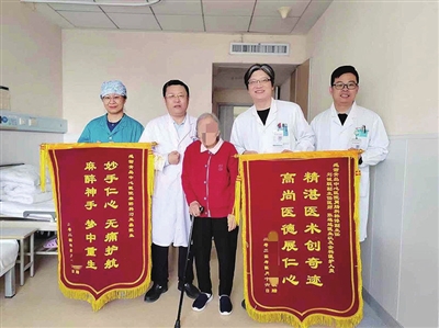 由于患者属于超高龄,这个年龄的老年人手术过程中可能出现更多的意外。高龄患者组织韧性减弱,脆性增加,术中牵拉出血的风险较低龄患者明显增大,手术难度进一步提高,对术者操作要求极高。在为田奶奶手术中,根据术前的准确诊断,加上手术医师术中熟练准确的操作,缩短了手术时间,减小了麻醉和手术的风险,确保了手术的成功。术后康复也十分重要,医护团队根据老人病理、生理特点,不断调整治疗方案,从胃肠道手术后的营养支持、长期卧床患者的血栓防控,到预防患者的肺部感染等问题,通过精细化、个体化术后管理,最终取得了良好的康复效果。治疗结束后,老人和家属给胃肠外科全体医护人员送上了一面写有“精湛医术创奇迹,高尚医德展仁心”字样的锦旗,赞扬胃肠外科医护人员精湛的医疗技术和细致入微的服务。