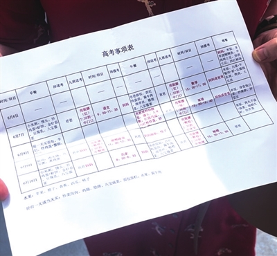 语文科目开考半个小时后,完成了班级送考任务的尚妮娜马不停蹄地赶往二中分校。尚妮娜从包里拿出提前打印好的高考日程表笑着说:“没有它我都不知道今年高考我该怎么安排。”