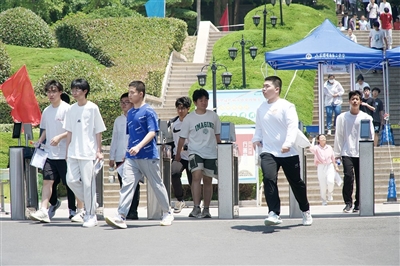 “咱二中的孩子呢?”“他们干什么去了?”……考点外,青岛二中考生的家长们翘首以盼,不时踮起脚尖向考点内张望。这时记者发现,近百名考生集结在二中校内阶梯处,他们简单组队后,沿着长长的阶梯意气风发地向校门口走来。