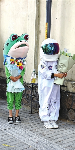 在青岛一中考点门口,一对分别装扮成宇航员和青蛙的双胞胎兄弟引起了大家的注意。双胞胎兄弟的妈妈告诉记者,兄弟俩特意打扮购买了宇航员和小青蛙的衣服到考场外等哥哥,希望能给哥哥一个惊喜。宇航员寓意着一飞冲天,青蛙寓意着顶呱呱,可爱的装扮背后是双胞胎兄弟对哥哥满满的爱。