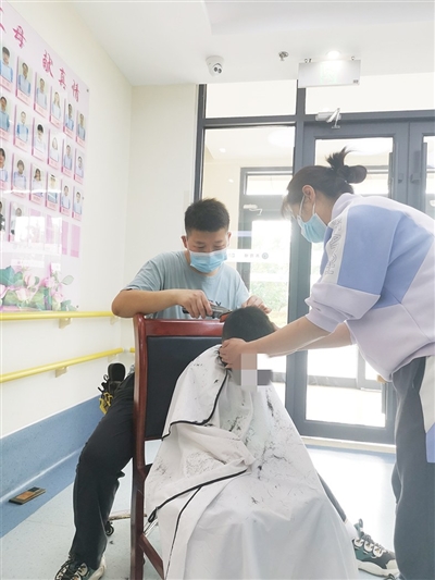第二位“顾客”是15岁的男生“伍子”。来铭源问:“帅哥要理什么样的发型?”“别太短,不然成‘光头强’了。”伍子边回答边会心地笑了。伍子心智健全,只是腿脚不便,考虑到天气渐热,来铭源为他剪了一个罗纳尔多式的娃娃头,伍子全程微笑。理完发后,杨老师为伍子拍了一张照片,他对这个发型十分满意。