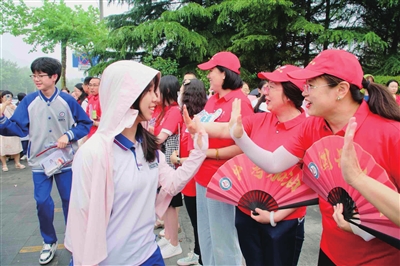 在青岛二实验考点,老师与考生击掌,送考生进考场。栾丕炜 摄
