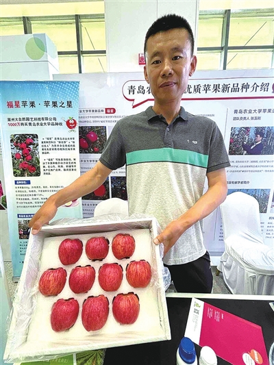 “这是青岛农业大学培育的‘福星’苹果,在咱山东也能种出冰糖心苹果。”从烟台赶来的莱州大自然园艺科技有限公司工作人员切开苹果让参展者品鉴。“有一种冰激凌味道,味道不错。”让工作人员没想到的是,“福星”苹果迎来开门红,受到欢迎,也遇到了不少感兴趣的种植户。据了解,莱州大自然园艺科技有限公司花1000万元购买了青岛农业大学“福星”苹果的品种权,主要培育“福星”苹果树苗,该品种已在全国各地试种四年,让山东种植的红富士也能拥有冰糖心,目前已在山东、山西、新疆等苹果产区推广应用。工作人员介绍,“福星”苹果可以免套袋,每亩地可节省人工费2000元,加上优果率高,每亩地可帮助种植户增收约4000元。