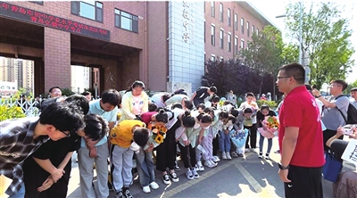 6月15日下午,随着历史科目考试交卷的铃声响起,青岛九年级中考落下帷幕。在弘毅中学考点外,青岛超银中学金沙路校区的考生们走出考场,接过家长们递过来的鲜花,集体向校区初三年级组长、物理老师于金刚深深鞠躬,感谢老师们的辛勤付出,感谢学校的培养呵护。 记者 董真