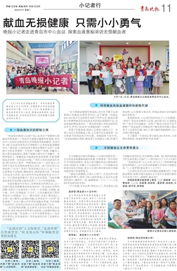 6月14日是世界献血者日。今年恰逢世界献血者日设立20周年,为增强青少年对血液健康知识的了解, 6月1日、15日,青岛晚报小记者走进青岛市中心血站,探索血液的奥秘,采访无偿献血者,用实践收获真知,深刻理解无偿献血的真正意义。