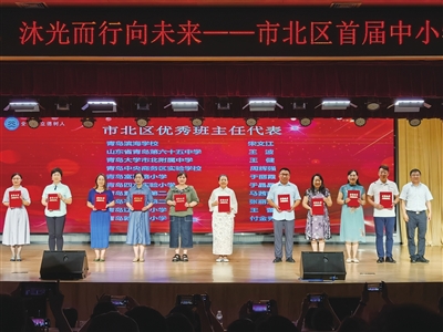 活动现场,青岛宁安路小学班主任、青岛市第三批名班主任工作室主持人原晓雯,展示了主题班会微课《文物诉说家国情怀》;市北区实验小学教师国雯与青岛第二十一中学教师张晗,分享班主任的育人故事,展现班主任的育人智慧和教育情怀;由青岛崇德小学校长张欣原创,青岛崇德小学、青岛明德小学、青岛市北中学、青岛第四十四中学的班主任们共同演唱的歌曲《飞扬的青春》,展现班主任们集智慧和才艺于一身,辛勤为学生们付出心血和青春;班主任主题论坛上,“家校社”三方共同就立德树人工作、凝聚育人合力做交流分享;青岛长沙路小学师生情景剧《是老师,是学生》,致敬班主任们,让在场老师们都湿了眼眶。活动最后,全体校长、师生代表共同合唱《小美满》,送给全区所有奋斗在一线的班主任们,感谢她们为学校工作的付出,带给学生的温暖和幸福。