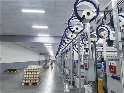 高大宽敞的厂房、轰鸣的纺纱机、戴着头巾忙碌的纺织女工,是很多人对纺织业的最初印象。但在即发十万纱锭纺纱项目车间,记者感受更多的是现代科技感——项目选用国内外先进的自动化生产和数字化管理设备,纱线生产全过程应用人工智能、大数据分析、5G通信等数字技术,实现了从原材料进场到产品入库所有环节的数字化、智能化、自动化操作。