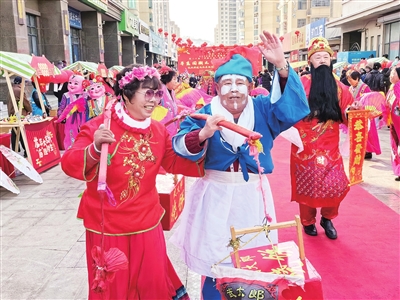 今年2月23日上午,李沧区九水东路社区商业街举行了元宵喜乐游园会:传统的扭秧歌、跑旱船轮番上演,唐僧师徒、财神等中华文化中的经典角色踏着欢快的鼓点相继亮相。30余名表演者走街串巷,给居民们带来欢乐。