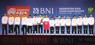 新华社北京7月2日电 在2日于印度尼西亚举行的2024年亚洲青年羽毛球锦标赛团体赛决赛中,中国队以总比分3:1战胜韩国队,时隔六年重夺亚青赛团体冠军。在赛后颁奖仪式上,国羽全队带着张志杰的球衣登上冠军领奖台。