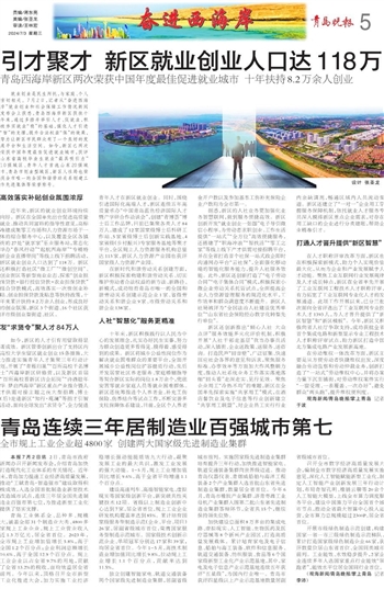 ~~~青岛西海岸新区两次荣获中国年度最佳促进就业城市 十年扶持8.2万余人创业