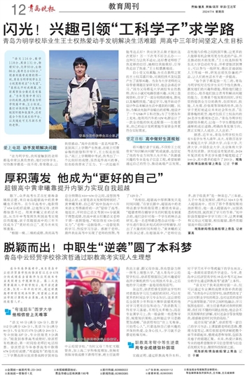 在今年春季高考中,来自青岛中云经济贸易学校的徐滨哲以总分678分的成绩在全省软件与应用技术专业类别考生中脱颖而出。高二从优质普高转入中职学校后,他开启逆袭之路,仅用一年半的时间,通过职教高考即将实现本科梦,有望被山东政法学院计算机专业录取,成为高素质技能型人才。