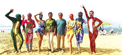 在第一海水浴场的沙滩上,身着各种图案的泳衣和脸基尼的模特们成为一道美丽的风景。她们按照衣服上图案的设计摆出各种灵动的姿势,演绎着设计师张式范的设计思想。模特们在沙滩上摆出各种姿势,为第九代脸基尼注入了鲜活的生命力。