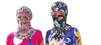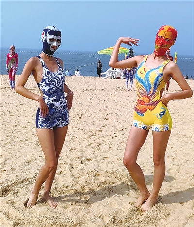 在第一海水浴场的脸基尼发布现场,记者见到了第九代脸基尼产品,与传统套头式的脸基尼不同,第九代脸基尼使用起来更加灵活,太阳较弱的时候,人们可以把面罩部分拉下来,当阳光比较强烈的时候,可以把面罩部分再拉上去。“这种设计既解决了脸基尼的透气性问题,同时也让脸基尼变得更加美观。”张式范说。