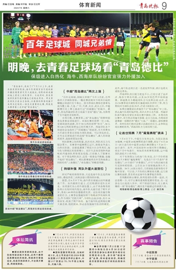 “百年足球城,同城兄弟情!”今年3月底,在西海岸大学城体育场,一幅在赛前被双方球员拉起的横幅让球迷们至今难忘。因为那场比赛标志着青岛成为继上海、大连、广州、天津、北京、武汉之后,中超联赛历史上第七座进行过“同城德比”的城市。最终,青岛西海岸队在主场赢下首场“德比”战,也取得了在中超的首场胜利。