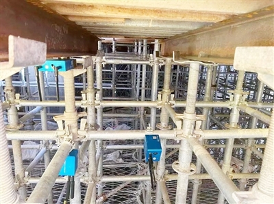 “简单来说,它能对模板支架的健康状态实现隔空‘把脉’。”在基坑底部,尤月华打开随身携带的笔记本电脑,展示了监测系统采集的实时监测数据。点开其中一个测量点,脚模的三维画面跃然眼前,脚手架内外有几十个不同的传感器,正对模板支架水平位移、立杆轴力、竖向位移、立杆倾斜、基础沉降等不同数据进行实时监测。“它支持远程监控、云端查看,工作人员无需到施工现场,就能实时掌握现场情况,监测数据可实时上传监测云平台。”一旦出现顶杆失稳、扣件失效、承压过大等引起的支撑轴力、模板沉降、相对位移、支撑体系倾斜等参数变化,这套监测系统会立刻通过无线声光报警器、短信及电话通知相关人员,现场作业人员可第一时间获取危险讯息,停止作业、迅速撤离现场。