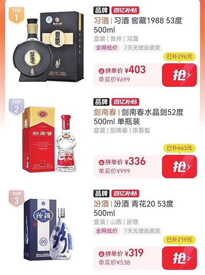 “‘618’百亿补贴的价格的确很诱人,比如剑南春水晶剑价格低到369元一瓶,而烟酒店进货价都要400元左右。习酒1988金爵版,‘618’期间下探到2900余元一箱,而在平时都是3300元以上。最能感动消费者的还是价格。” 王林说。