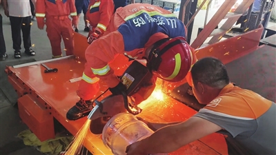 救援人员观察发现,女子的手臂被夹在钢板和轴承中间,如果直接破拆轴承,容易对女子的手臂造成二次伤害,于是决定对轴承一体的钢板进行破拆。救援人员使用无齿锯将钢板切开一个口,通过破拆口,利用哈里根撬棍顶住钢板,并用液压机动扩张钳对传输带进行扩张,扩大救援空间。经过30分钟的紧张救援,女子脱险,被急救人员送往医院接受进一步治疗。
