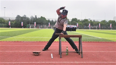 7月24日上午9时许,在六十七中操场的开幕式现场,随着两架由保安操作的无人机展开横幅,保安队员展示了精湛的技能:有的保安队员表演了地铁安检操和百人警棍盾牌操,有的保安队员展现了头顶碎酒瓶、徒手劈砖等硬气功,还有的保安展现了摔擒技法,金融押运公司的保安员列队进场后,还展现了蒙眼拆装防暴枪的技能。