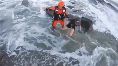 本报7月29日讯 受台风“格美”影响,7月28日,青岛沿岸风浪较大。当天傍晚,消防救援人员在奥帆中心东部海域礁石上,营救了一名被困女游客。