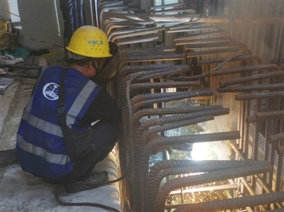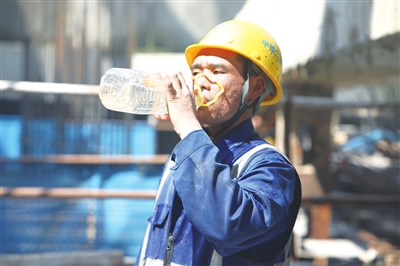 今年42岁的钢筋工吴学启,身穿长袖厚衣服,拿着一个两升装的大号瓶子,仰着脖子大口喝着水。“已经喝完一瓶了,这是今天的第二瓶。”吴学启告诉记者,因为有电焊作业,为防止火花溅落到身上,他们必须穿着长袖厚衣服。有时候,作业时需要弯腰蹲在并不宽敞的空间内,吴学启拿起护目镜开始电焊,现场随即火花四溅。吴学启的脸上,汗水不断往下流,导致衣服全都湿透了,如水洗了一样。“一天下来,至少要喝五升水吧。”虽然喝水多,但吴学启依旧感觉不解渴。开始作业前,他会喝上一瓶项目部发的藿香正气水,结束施工回到地面,也会喝上一碗绿豆汤。“项目部在宿舍配备了空调,中午回去冲个凉,把衣服用水洗一洗,下午上班就可以穿了。”吴学启说。