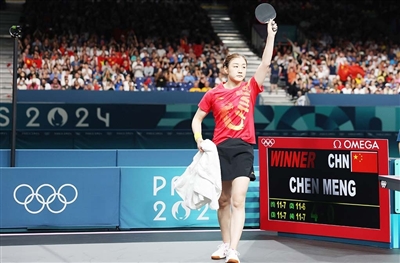 8月2日,在巴黎奥运会乒乓球女单半决赛中,中国选手孙颖莎4比0战胜日本选手早田希娜,晋级决赛。孙颖莎与之前晋级的陈梦成功会师女单决赛。新华社发