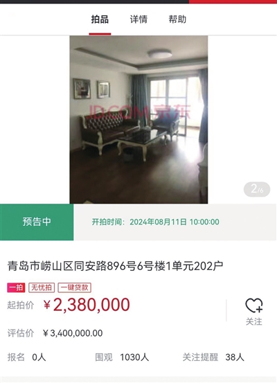 今年3月12日,崂山区奥林花园的一套法拍房在京东资产交易平台上拍,一拍起拍价为320.35万元,虽有1人报名但未出价,最终流拍。4月,该房产进行二轮拍卖,与一拍的惨淡不同,二拍参与人数猛增,在12人54次的竞价后,最终以高出一拍价21.2万元的价格成交。根据目前的法拍房相应政策规定,一拍起拍价通常基于法院评估价的70%至80%,如果一拍未能成交,二拍起拍价会在一拍基础上打折,因此为了以更低价格购得房产,许多竞拍者在一拍时持观望态度,希望等待二拍降价再出手。然而,当二拍真的来临时,他们发现心仪的房源已经被众多竞拍者盯上,为了争夺房源,不得不提高出价,最终推高了成交价格。