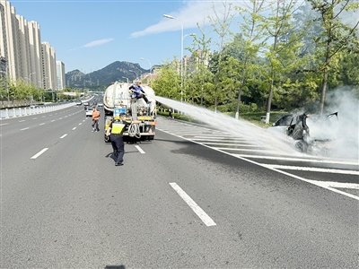 “我们俩当时在给树浇水,交警突然上来告诉我们,那边有辆车起火了。”洒水车司机、56岁的褚明刚告诉记者,起火车辆位于对向车道,他将情况告知同事张行远,两人立刻将车开到前方路口调头,行驶到离起火车辆大约5米远的位置,将水管调整到最大流量,对准起火车辆猛喷,大约1分钟后将车辆明火扑灭。随后,消防救援人员抵达现场,确认火苗没有复燃风险。