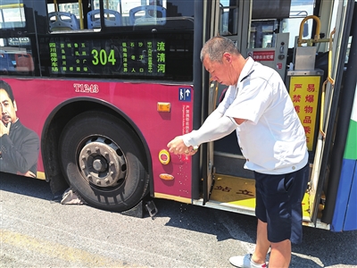 4日上午,孙佩昌早早来到停车场,做好安全叮嘱、酒精测试、出勤签字等一系列准备工作后,来到车辆前对车辆进行检查,此时室外温度达到33℃,只见他认真地查看轮胎、玻璃以及车内服务设施……一切准备停当,孙佩昌坐到驾驶座上。他驾驶的是没有空调的车型,此时,车内温度超过37℃,他工装后背已湿透,汗水顺着面颊不时流下来。